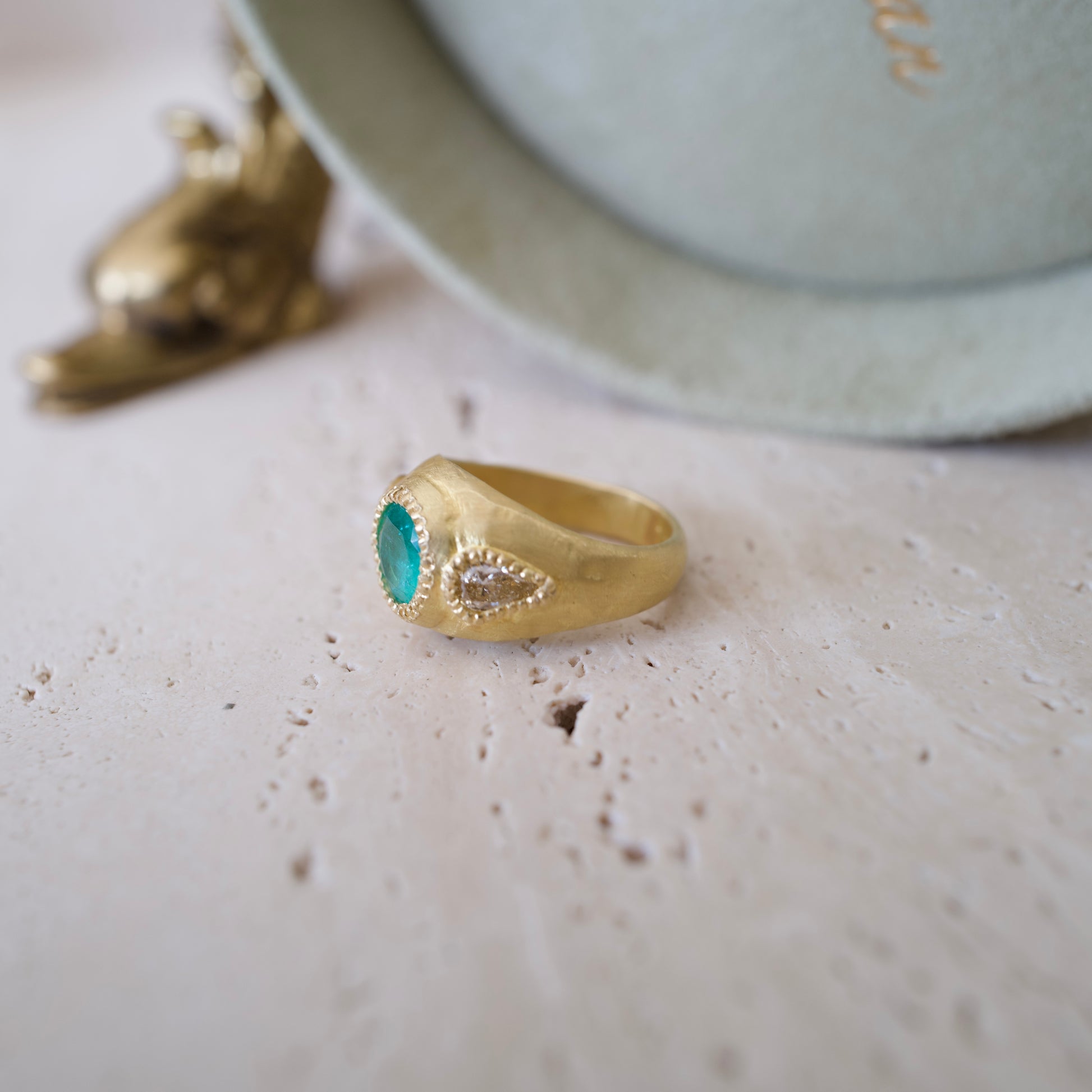 Colombian emerald and pear shaped diamonds set in an 18k gold ring with granulation detail. All handmade.