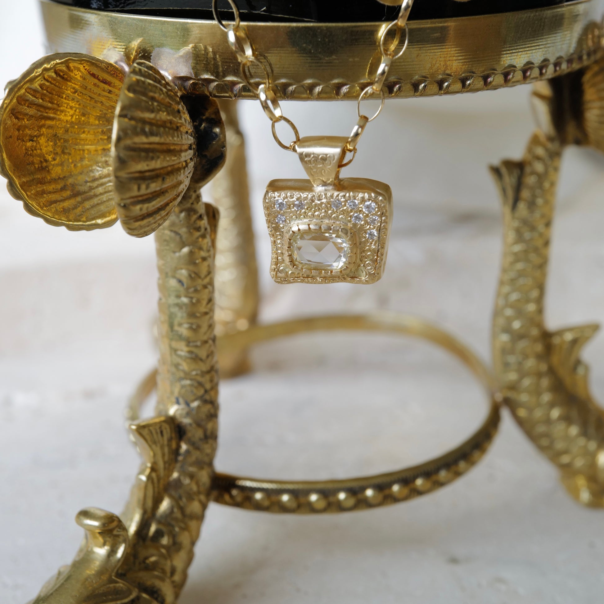 White rose cut diamond set in 18k gold pendant surrounded by white diamonds on an 18k gold chain necklace. All handmade.